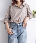 袖のシャーリングや斜めボタンなど特徴的なデザインのブラウスです。シャーリングで袖丈を調節できるので、長期間着ていただけます!ウエストにはゴムが入っているため、着痩せ効果があります♪