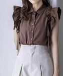 肩のフリルにリボンがついていて可愛らしいブラウスです。ノースリーブですがフリルのボリューム感で細見え効果があります!さらにインできる着丈なのでスッキリと着用いただけます♪