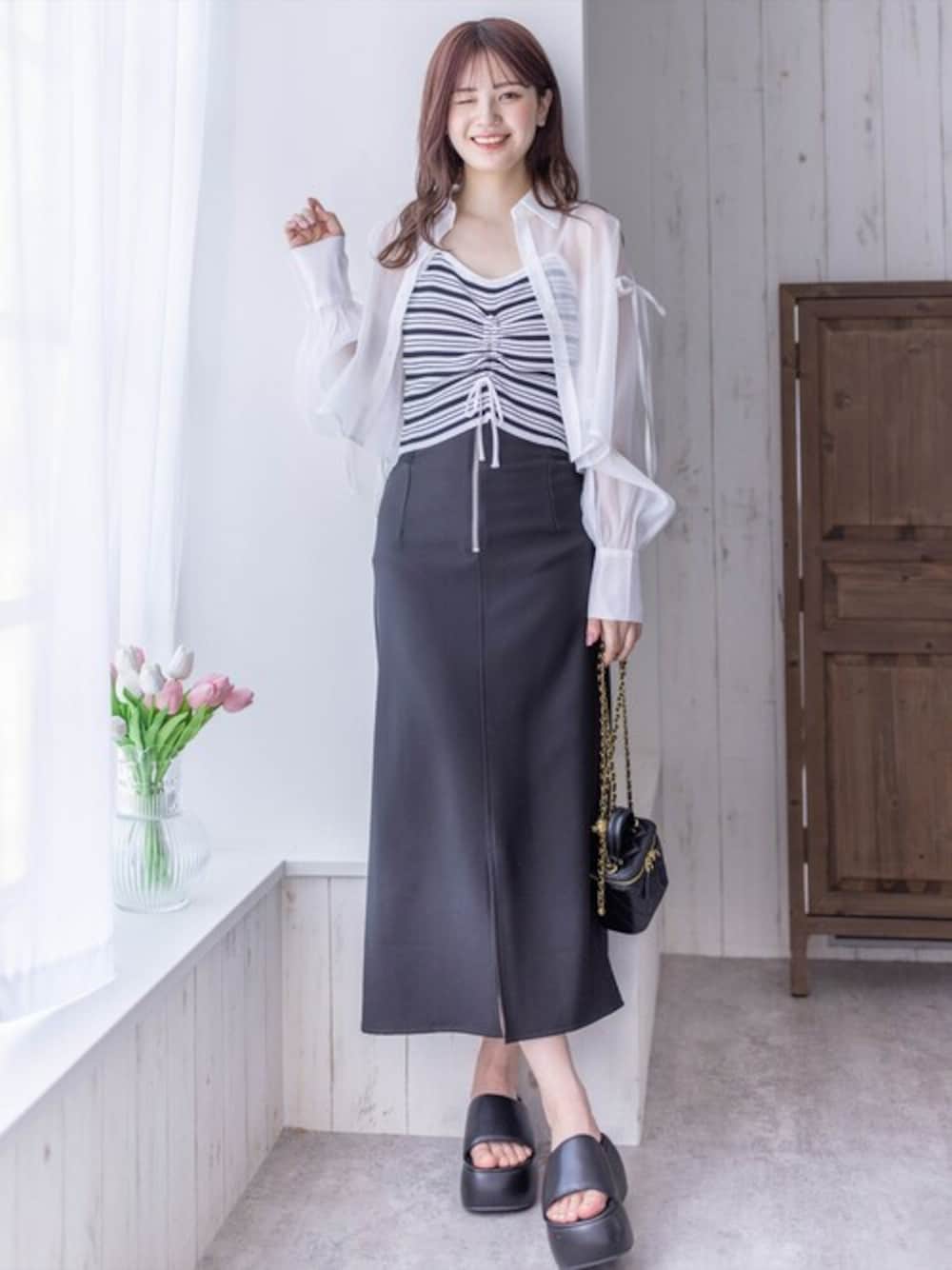 フロントのドロストデザインが、キャミの丈感調整ができるのでお好みの長さで着ていただけます!また、ボーダーが可愛らしいので1枚でもお使いいただけます。