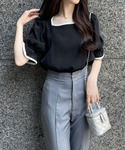 透け感と表面変化のある生地で夏でも涼しげに着ていただけるブラウスです。さらに配色パイピングが目を引くポイントです!ボリューム感のあるキャンディースリーブで可愛らしい印象になります♪