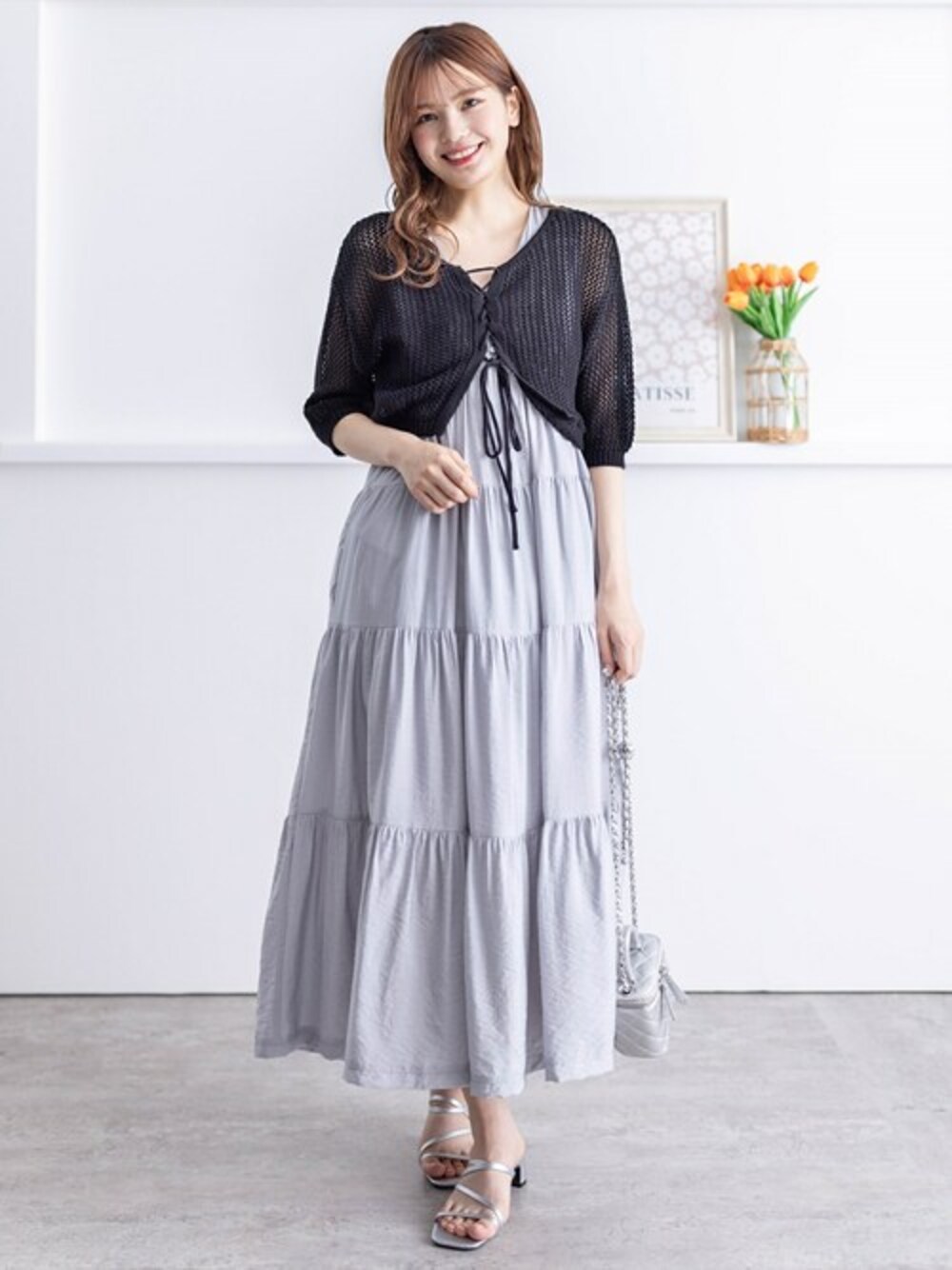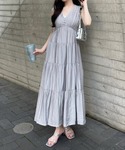 裾に向かって広がるシルエットがきれいなティアードワンピースです。ウエストをリボンで絞ることができるので、メリハリをつけることができます♪Vネックなので首元がスッキリとした印象になります!
