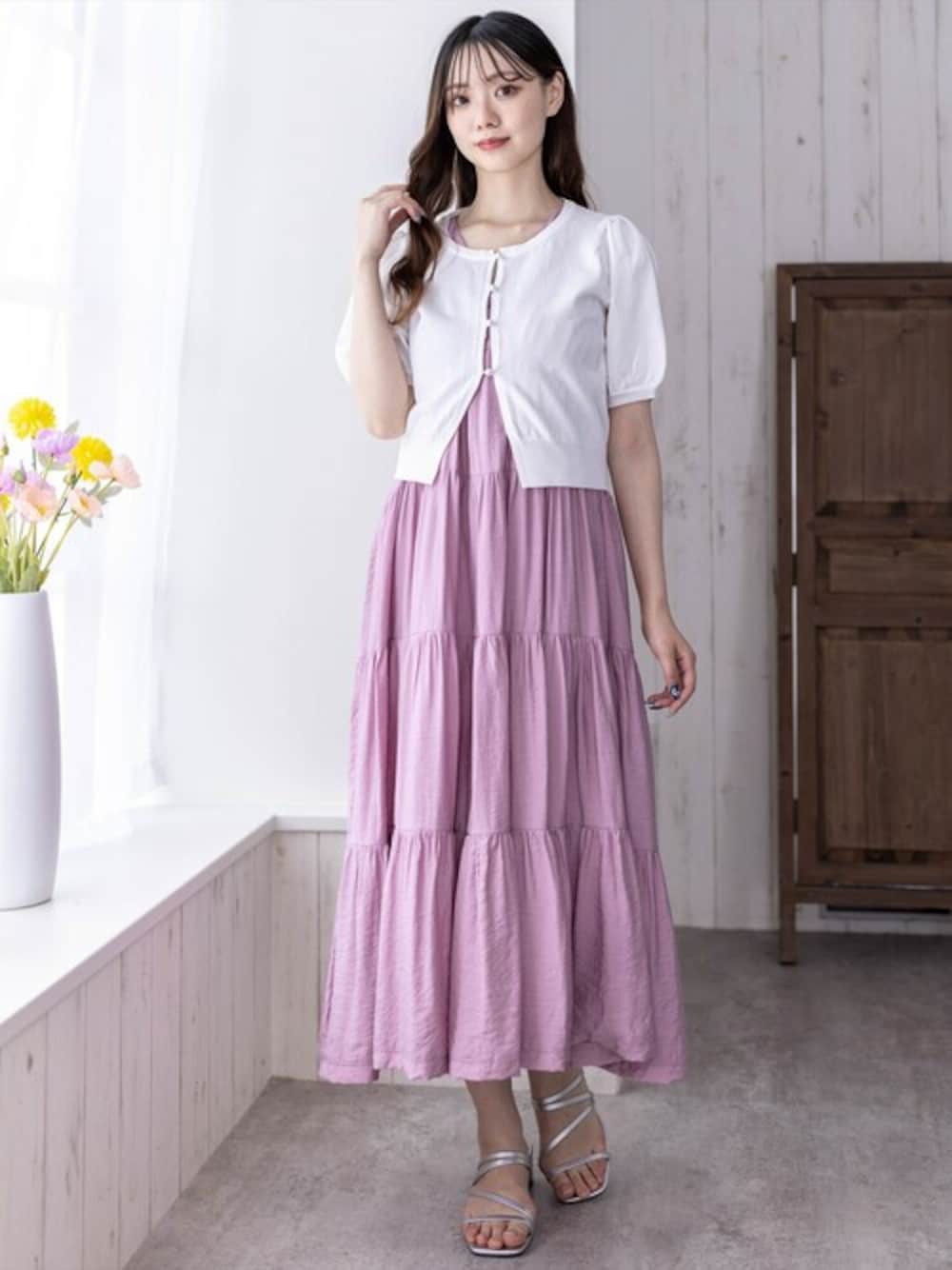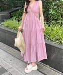 裾に向かって広がるシルエットがきれいなティアードワンピースです。ウエストをリボンで絞ることができるので、メリハリをつけることができます♪Vネックなので首元がスッキリとした印象になります!
