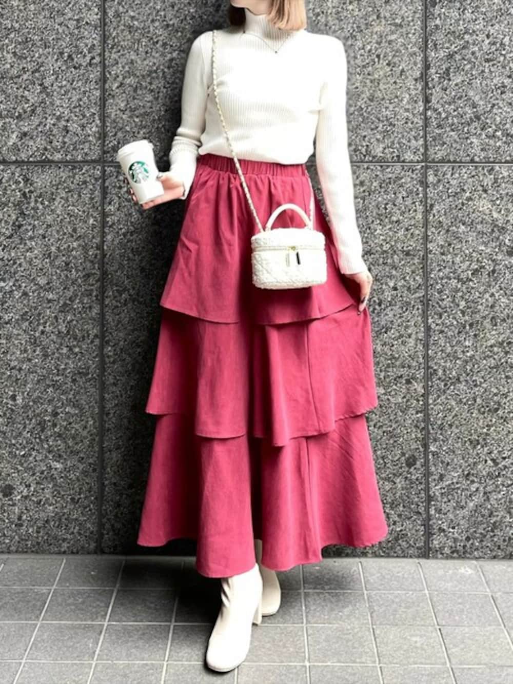 clear(クリア)(clear)のスカート「ピーチ起毛3段ティアードロングスカート [低身長用サイズ有 ボリューム感 カジュアルにも]≪再入荷≫」を使ったコーディネート