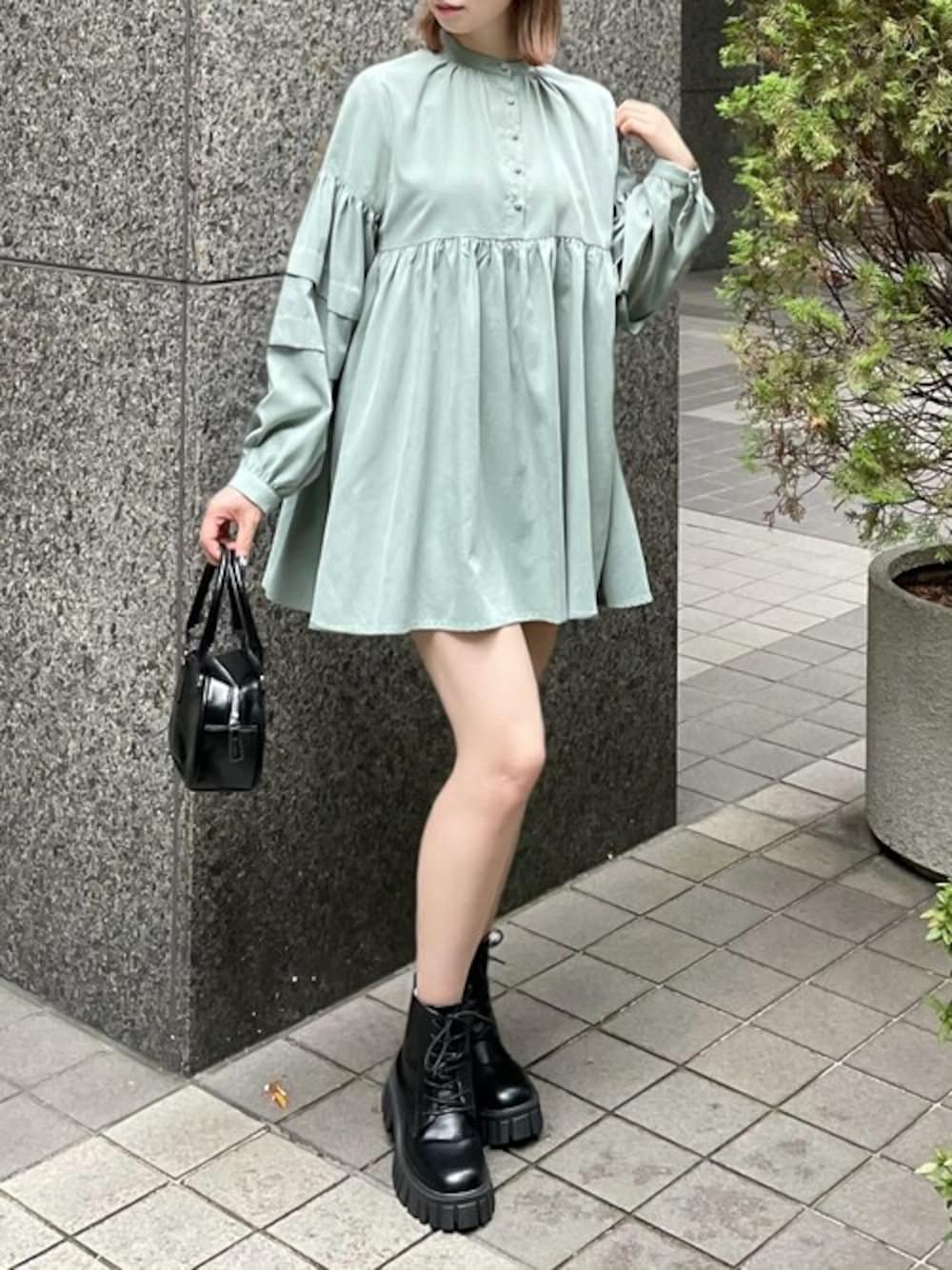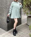 フロントのクルミボタンやボリューム感のある袖が可愛いデザインのブラウスです。シルエットを拾わないチュニック丈なので、気になる部分をカバーできます!さらにウエスト部分に切り替えがあるので、自然とスタイルアップが叶います♪
