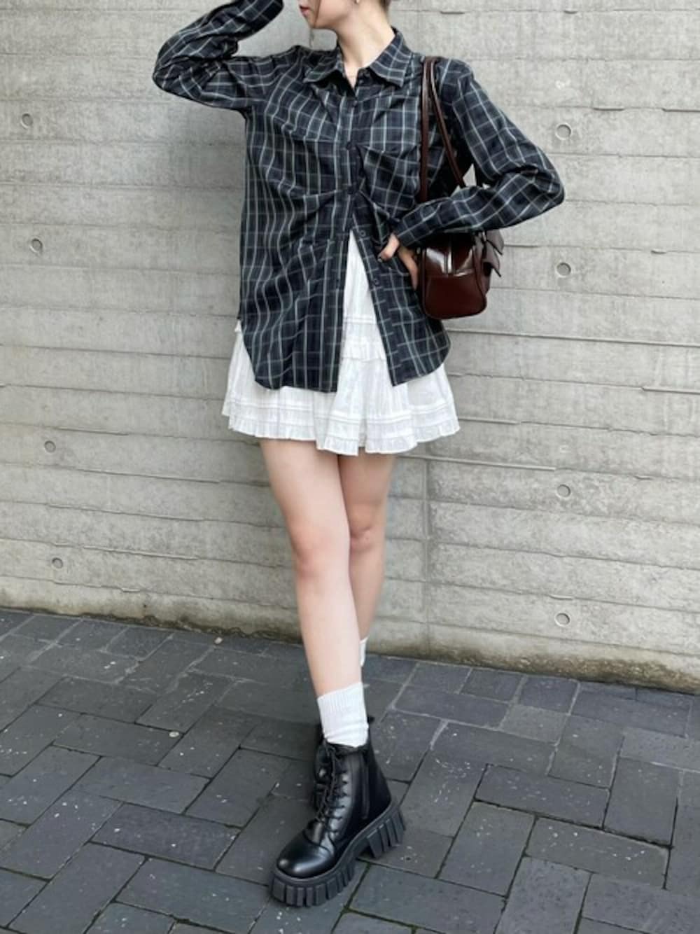 タックよるボリューム感が目を引くトップスです。さらに存在感のあるチェック柄なのでコーデのポイントになります♪着丈も長めなので、気になる部分をカバーできます!