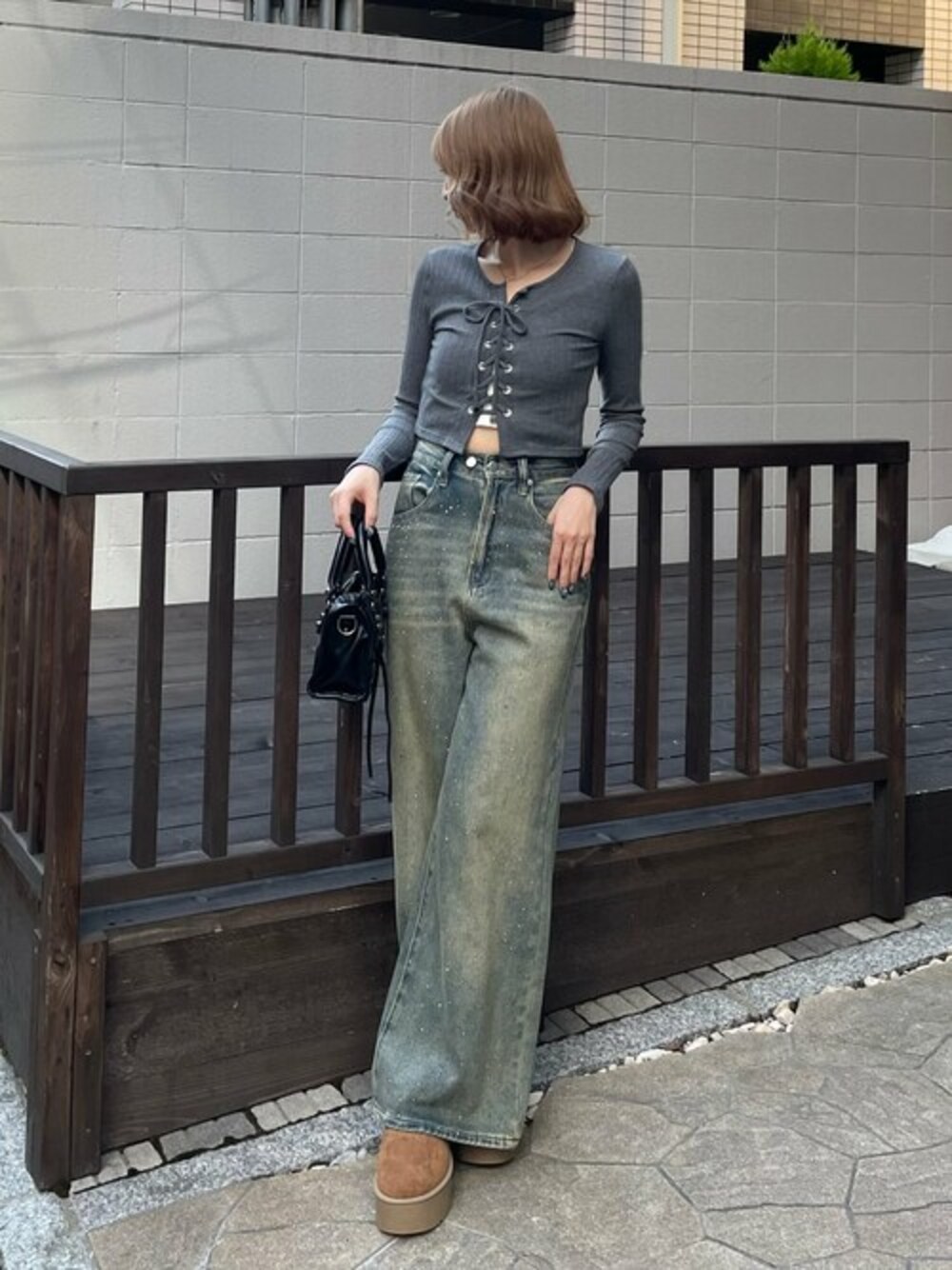 clear(クリア)(clear)のTシャツ/カットソー「フロントスピンドルワイドリブ長袖カットソートップス [肌見せコーデ 韓国コーデ]≪2024AW新作≫」を使ったコーディネート