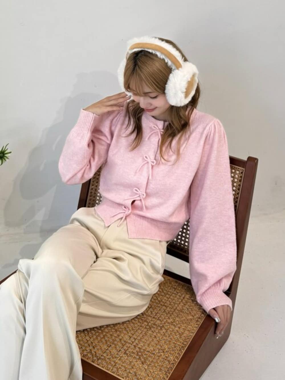 フロントにリボンが施されてるトレンド感のあるカーディガンです。カーディガンとしても、閉じてトップス使いもしていただけます!柔らかく肌触りの良いニットで、着心地も抜群です♪
