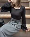袖のレース素材で上品な印象が叶うトップスです。スクエアネックなので首周りの華奢見えが効果があります♪さらに着心地の良いカットソー生地で楽にご着用いただけます!