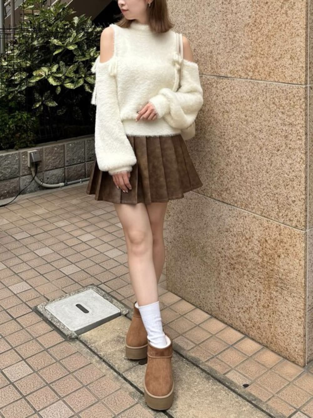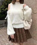 オープンショルダーでヘルシーな肌見せが叶うニットトップスです。肩部分にリボンがついていて、あざと可愛い印象になります♪フェザー素材でトレンド感のあるコーデが完成します!
