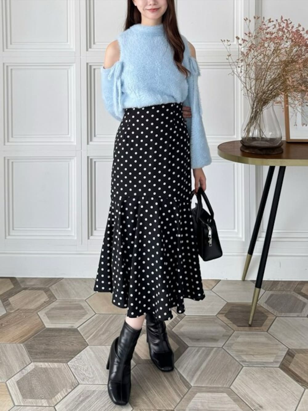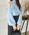 オープンショルダーでヘルシーな肌見せが叶うニットトップスです。肩部分にリボンがついていて、あざと可愛い印象になります♪フェザー素材でトレンド感のあるコーデが完成します!
