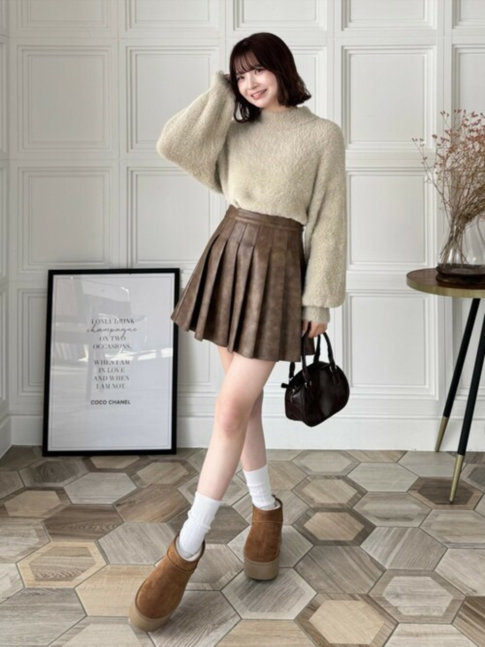 オープンショルダーでヘルシーな肌見せが叶うニットトップスです。肩部分にリボンがついていて、あざと可愛い印象になります♪フェザー素材でトレンド感のあるコーデが完成します!