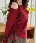 ワンショルデザインでヘルシーな肌見せが叶うニットトップスです。さらにトレンド感のあるサイドのドロストもコーデのポイントになります♪ドロストを絞って、ハイウエストのボトムス合わせでさらにスタイルアップが叶います!