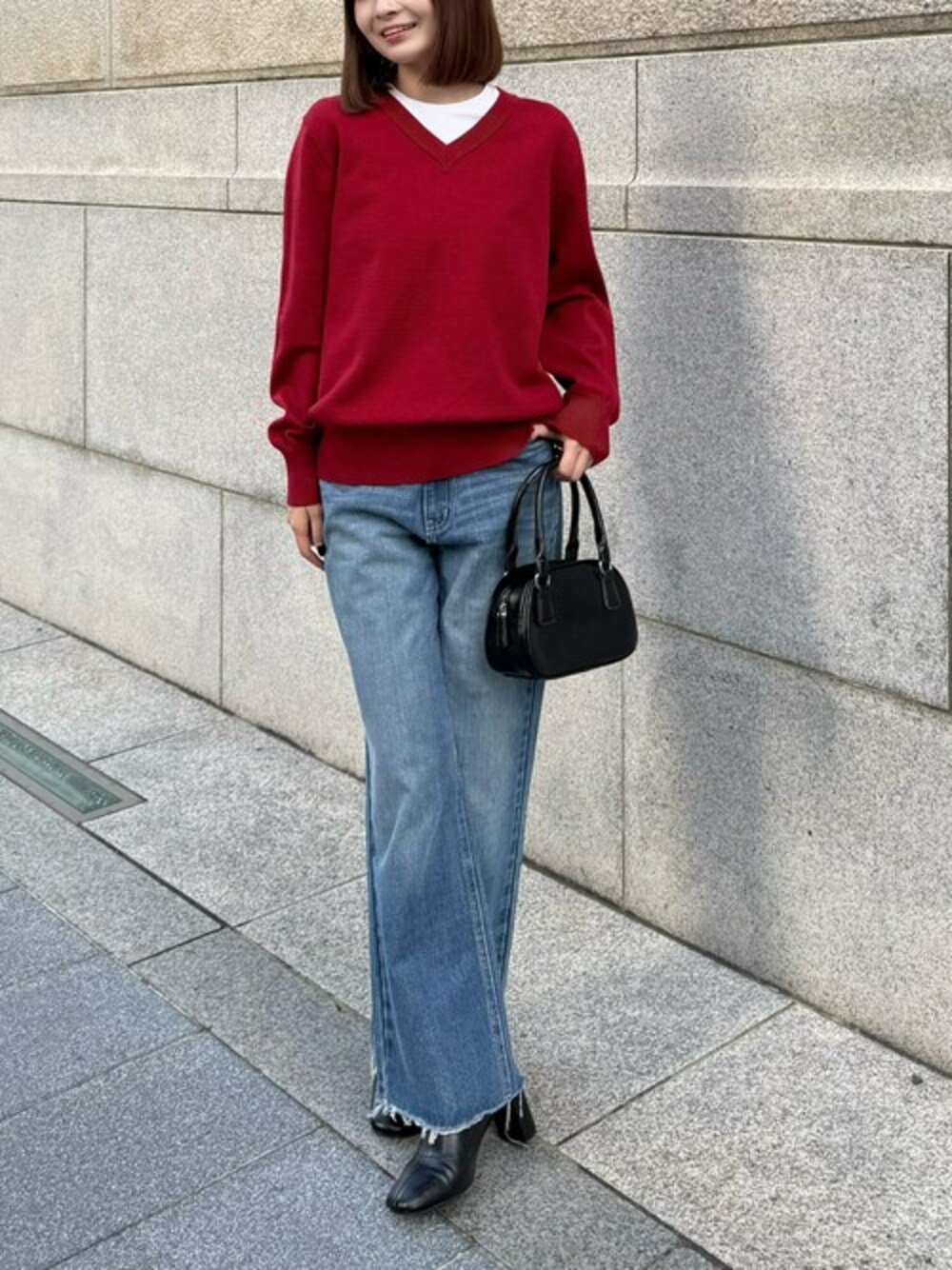 シンプルな大人カジュアルコーデです。 目を惹く赤色のトップスがポイントです♪