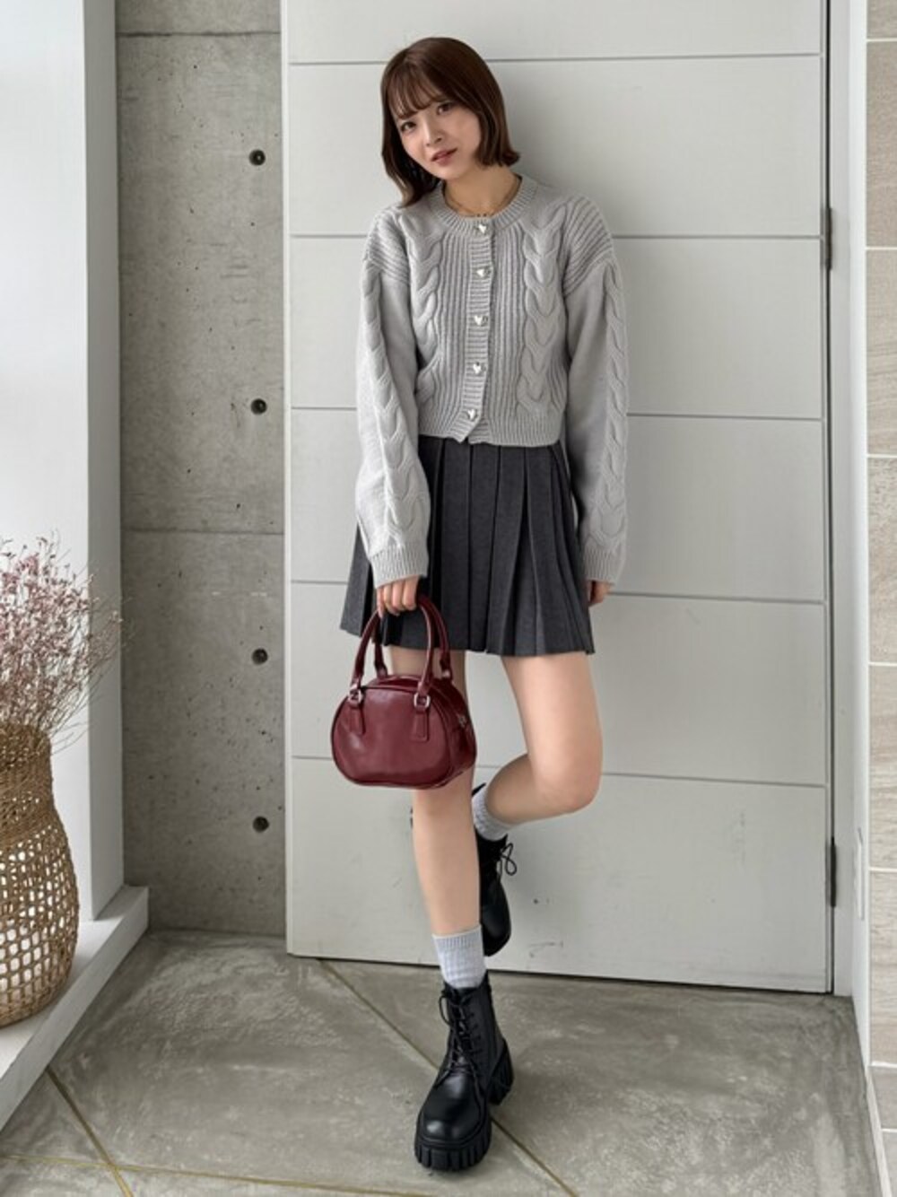 コロンとしたハートの釦が可愛いケーブルニットカーディガン。 ざっくりとした編地とボリューム感がシーズンムードを高めてくれます。 シンプルながらもニットのケーブルの存在感がコーデの主役になる一枚です。 ニット素材で季節感のあるプリーツスカートです。程よく広がっているプリーツで、着るだけで美脚効果が叶います♪ウエストはゴム仕様なので、楽にご着用いただけます!