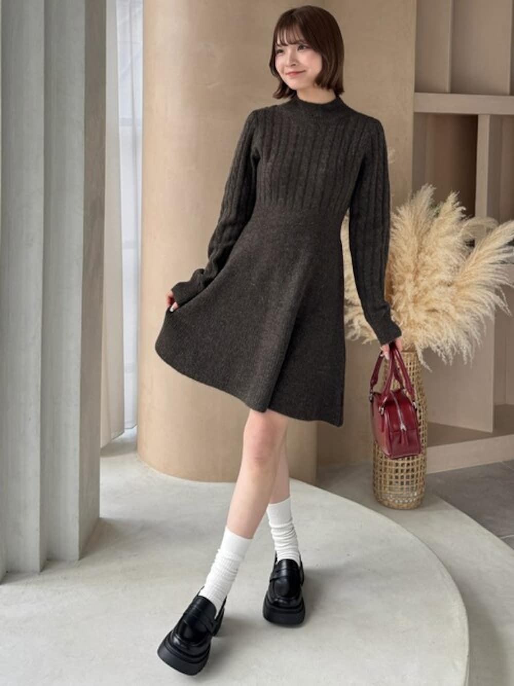 冬の気分を盛り上げてくれるケーブルミニニットワンピース。 伸縮性のあるニット素材で、程よく体にフィットし、ボディラインをきれいに見せてくれます。ローファーに合わせて大人ガーリーな印象にしてみました。 .