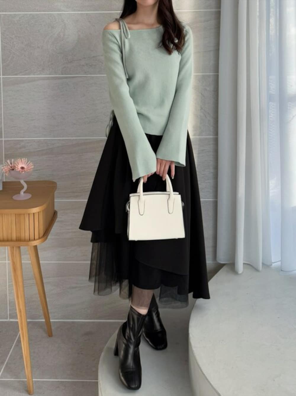 ワンショルデザインでヘルシーな肌見せが叶うニットトップスです。さらにトレンド感のあるサイドのドロストもコーデのポイントになります♪ドロストを絞って、ハイウエストのボトムス合わせでさらにスタイルアップが叶います!また大人気のスカートが春仕様の生地で新登場したので合わせてみました♪ボリューム感があり、チュールもドッキングされているので高見え間違いなしです。さらにハイウエストでご着用いただけますので、スタイルアップが叶います!