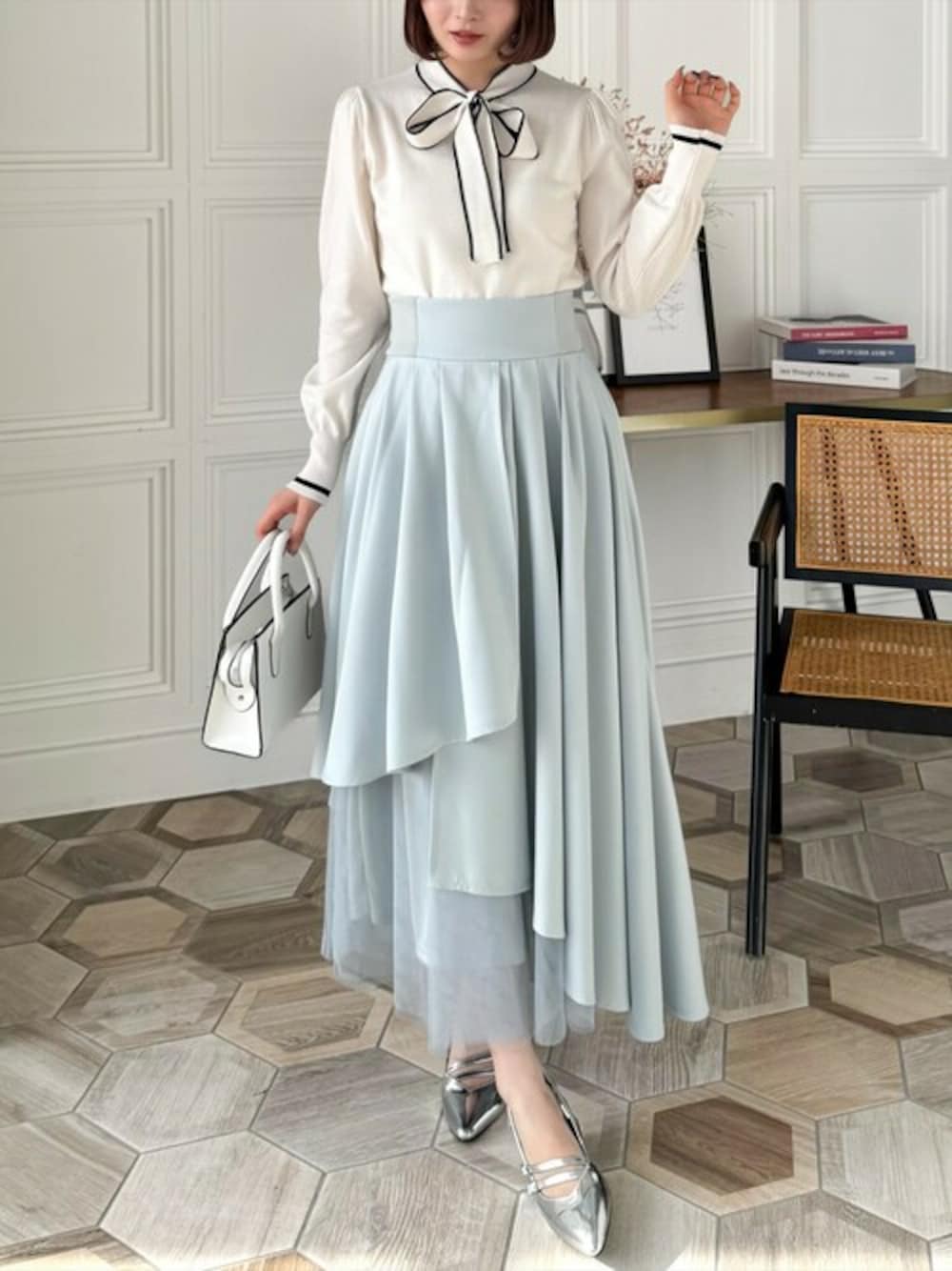 ボウタイデザインによって顔周りが華やかな印象になるニットトップスです。さらに配色によりコーデのアクセントになります!コンパクトなシルエットなので、スタイルアップも叶います♪ 大人気のスカートが春仕様の生地で新登場!ボリューム感があり、チュールもドッキングされているので高見え間違いなしです。さらにハイウエストでご着用いただけますので、スタイルアップが叶います♪