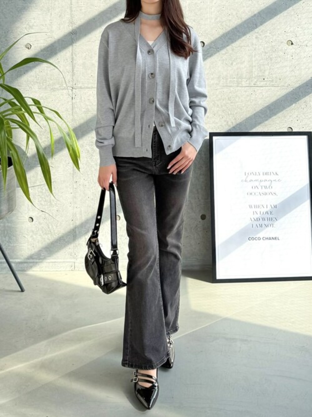 トレンド感のあるチョーカー付きのニットカーディガンです。アシンメトリーなボタンでデザイン性があります!さらにVネックなのでデコルテラインの華奢見えが叶います♪ 裾に向かって広がるデザインで、スタイルアップ効果があります。カジュアルになりやすいデニムコーデですが、フレアパンツだと大人っぽい印象になります!