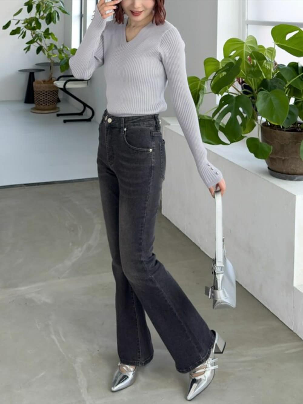 clear(クリア)(clear)のデニムパンツ「【低身長対応/サイズ展開あり】ミドルライズフレアデニムパンツ≪再入荷≫」を使ったコーディネート