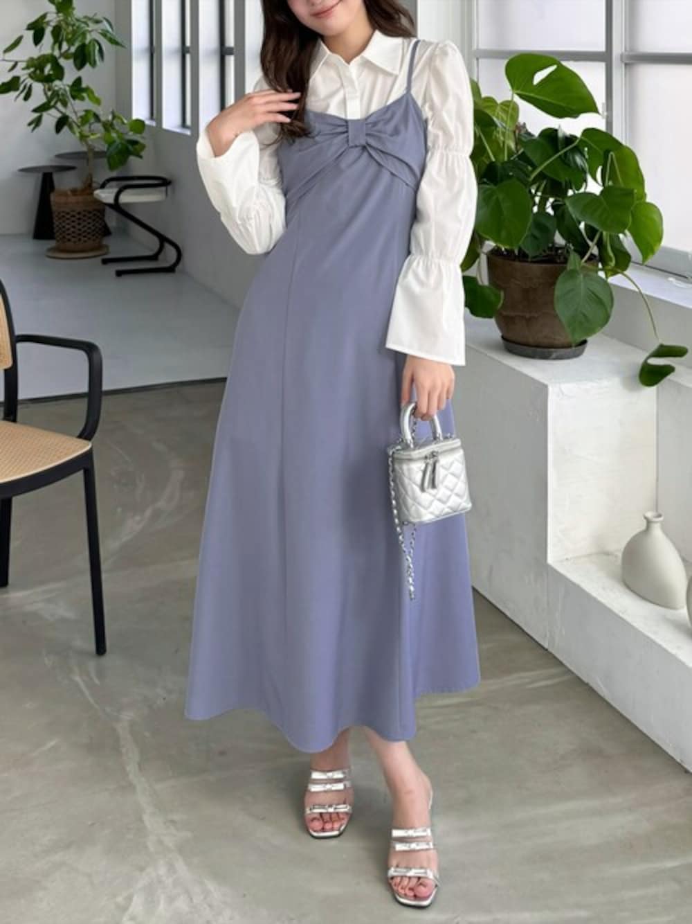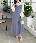 袖のボリュームが可愛い!マムルークスリーブ長袖ブラウスに 胸元のリボンデザインが可愛いキャミワンピースを合わせました♪ ゆとりのあるシルエットで、体型に関係なくご着用いただけます! 肩紐はアジャスター付きで調節可能になっています。