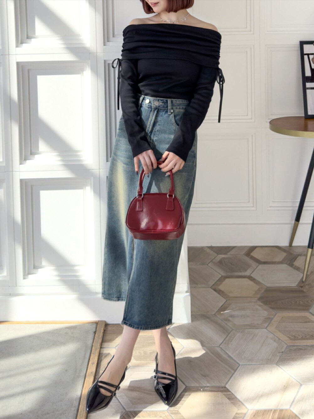 オフショル仕様なので、ヘルシーな肌見せが叶うカットソートップスです。 サイドのリボンがポイントです♡ 程よくフィットする生地で、身体のラインを綺麗に見せてくれます! デニムのスカートを合わせることでカジュアルよりにしました。