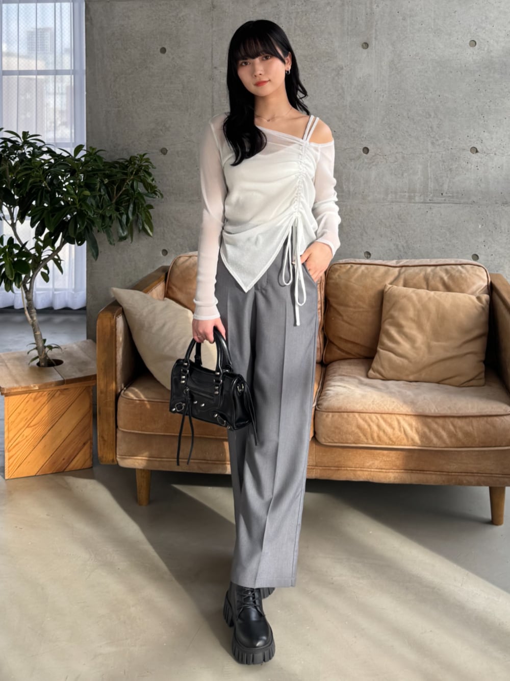 トレンドライクなドロストがほどこされたカットソートップスです。ワンショル仕様ですが肩紐があるので、ご着用いただきやすくなっております! ラメ感やシアー感のある生地で、コーデに抜け感がプラスされます♪