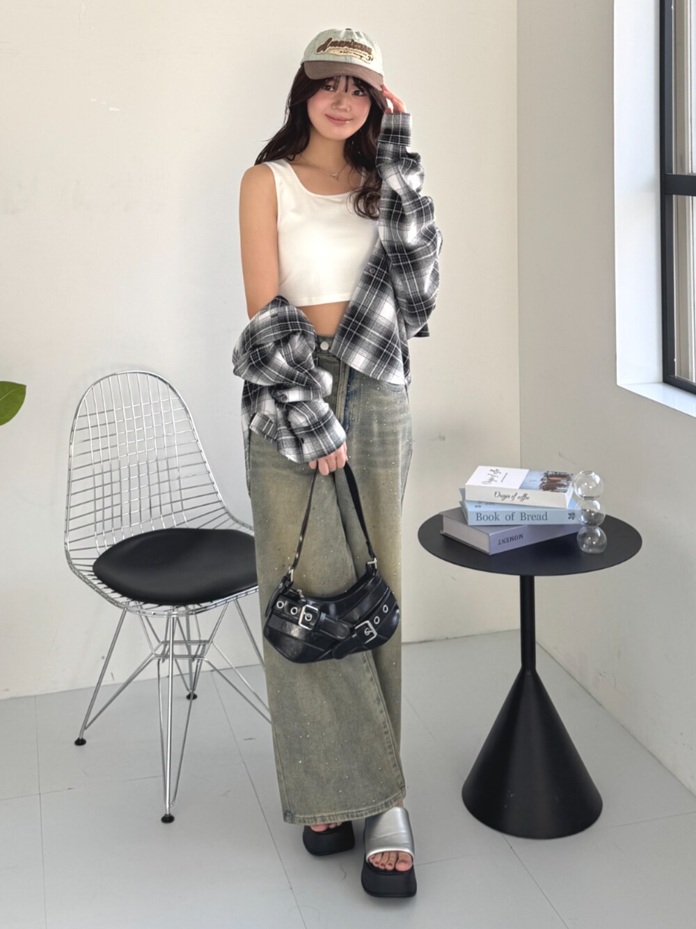 今季トレンドのチェック柄を取り入れたカジュアルなコーディネートです。