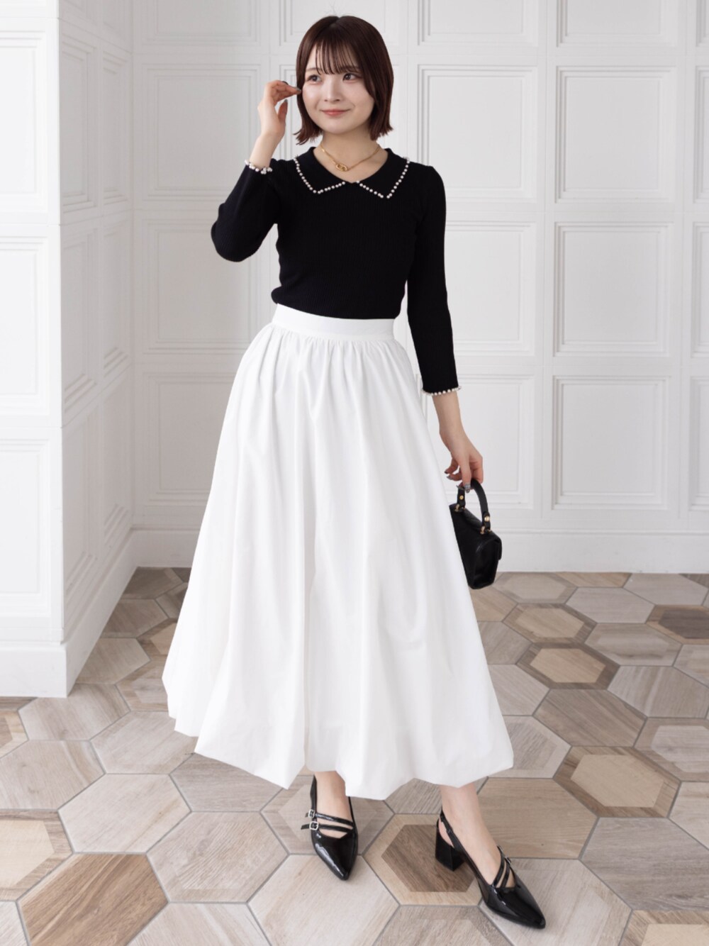 モノクロでも可愛い大人フェミニンコーデ! トレンドのバルーンスカートがポイントです♡