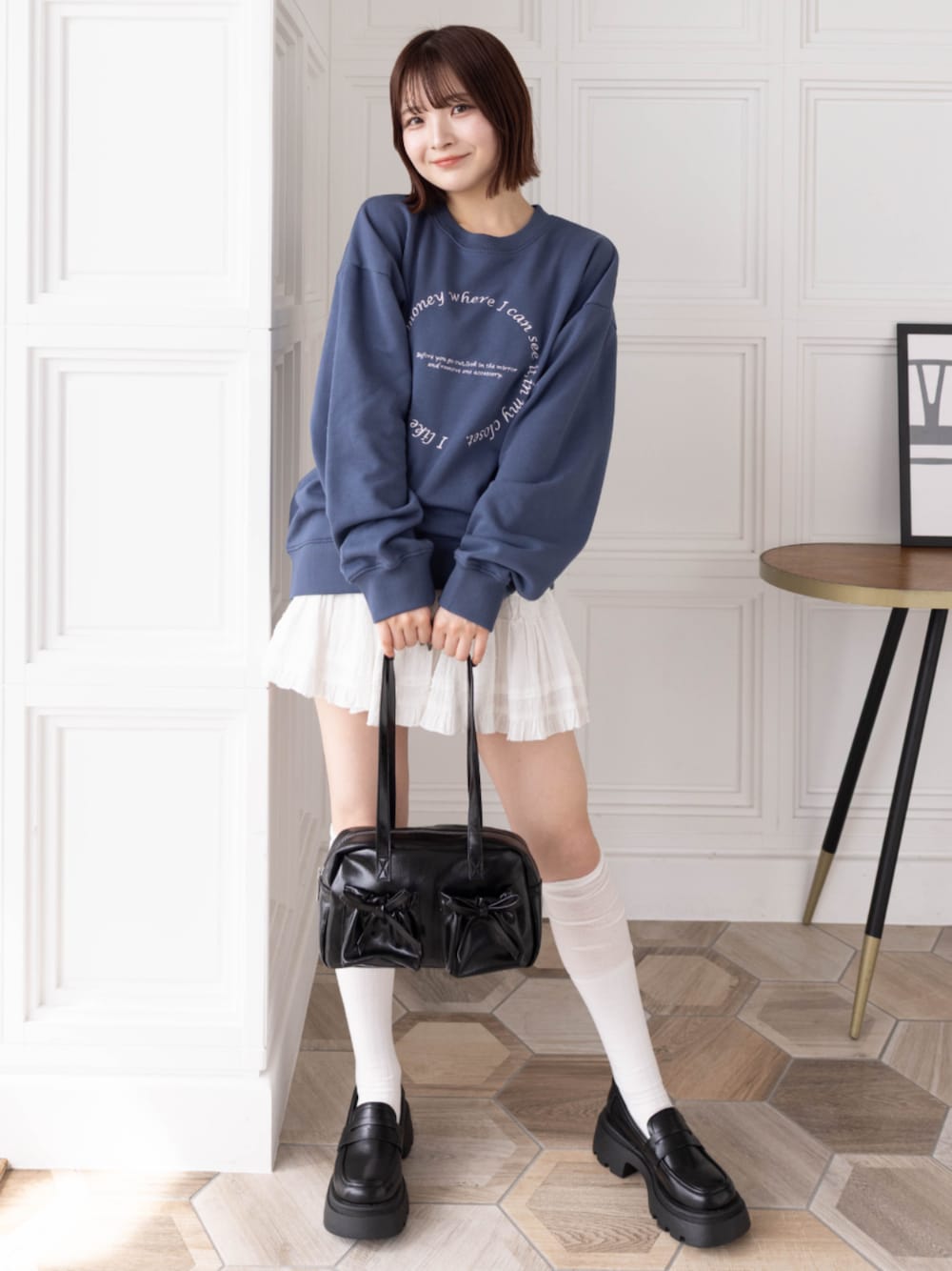スウェットとミニスカートの組み合わせで完成! スクール風ガーリーコーデです♡