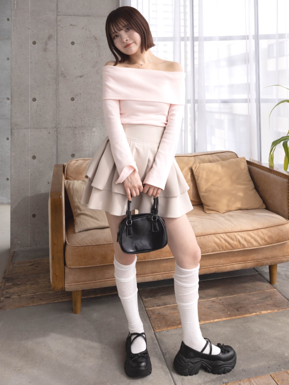 ピンクのオフショルがポイント! 春におすすめなガーリースタイルです♡