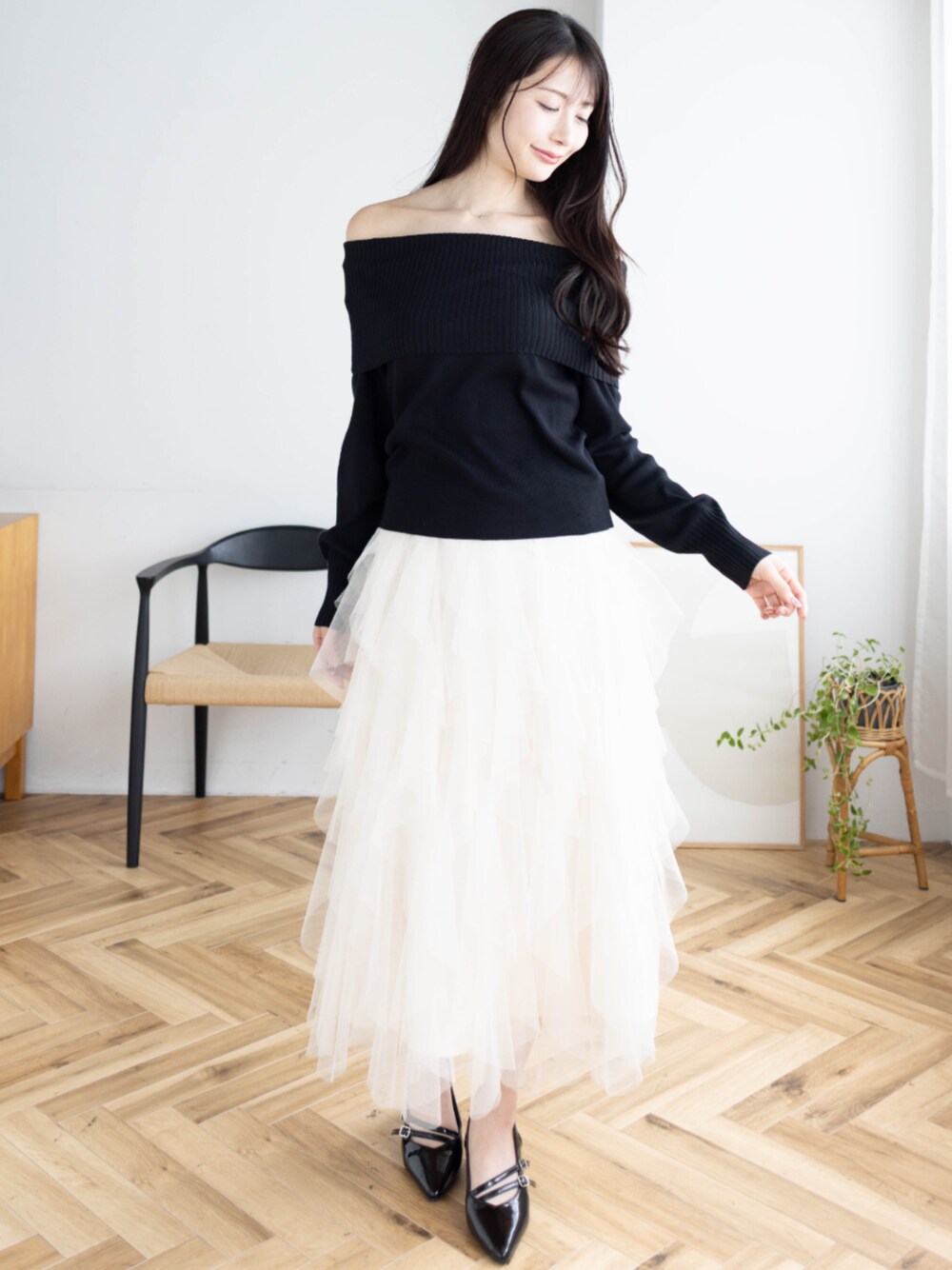 上品なイメージになるオフショルトップスを使った 大人フェミニンなコーディネートです♪