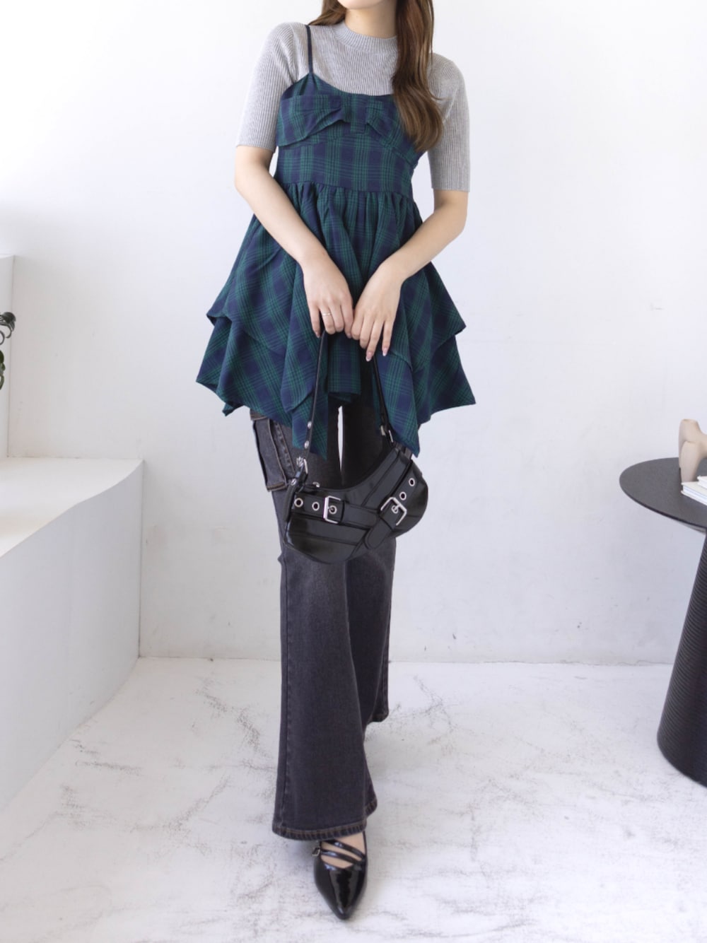 チェック柄のビスチェ風トップスに、フレアデニムをレイヤード。 シックなブラック小物を合わせることで、甘さを抑えた大人のバランスに仕上げました。 日常のお出かけにも、さりげなく個性を演出できるスタイリングです。