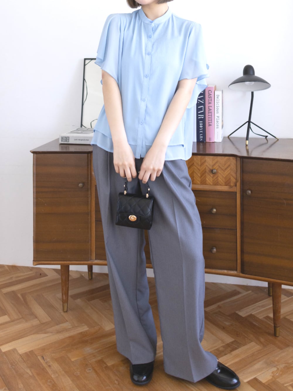 ライトブルーのスタンドカラーシャツに、グレートーンのワイドパンツを合わせた洗練されたスタイリング。 ミニバッグやブラックのシューズで全体を引き締め、上品ながらも抜け感のある大人のカジュアルスタイルに仕上げました。 シンプルながらも計算されたバランスが魅力のコーディネートです。