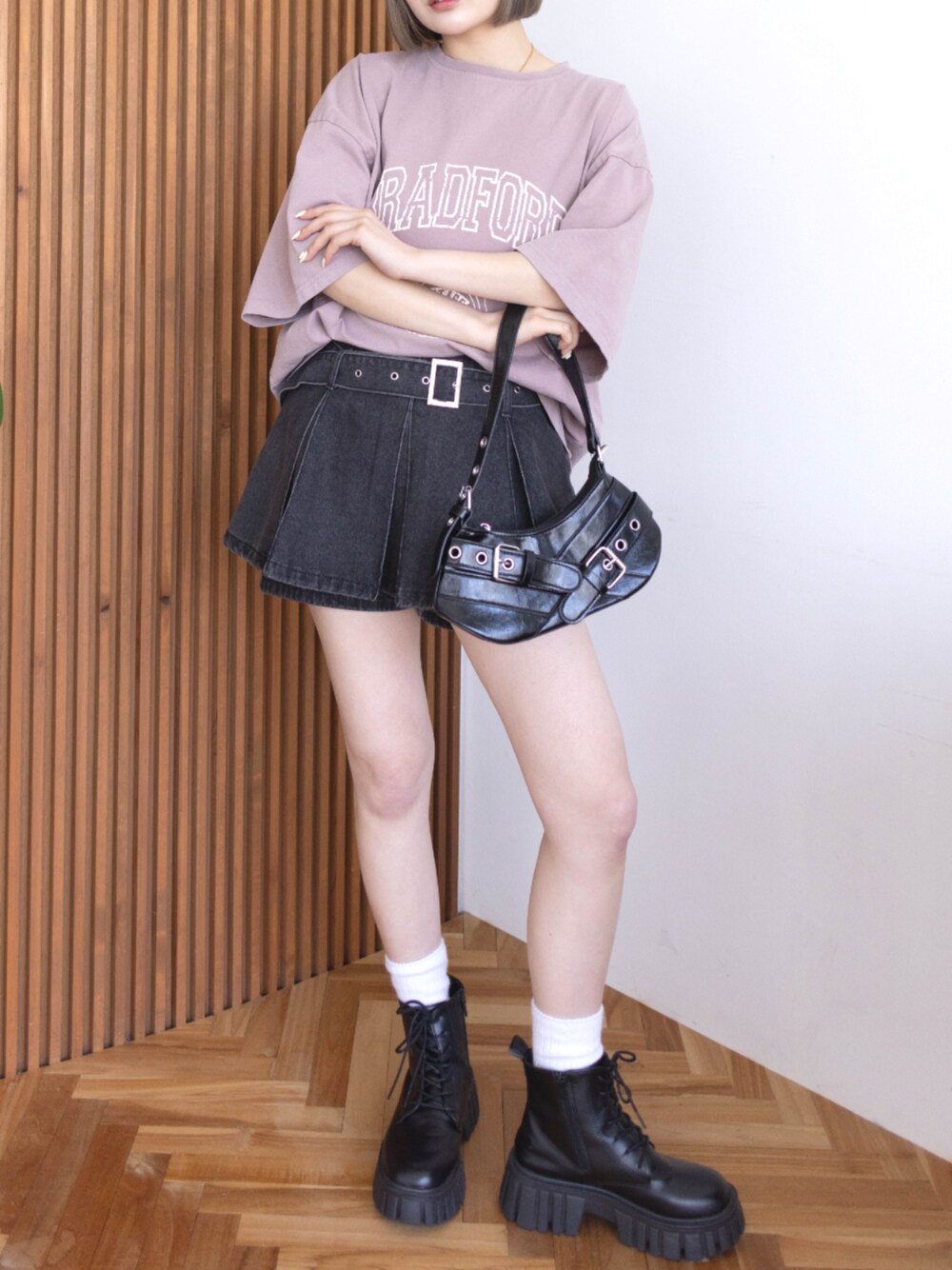 ロゴT×ブラックミニでちょっぴり辛口ガーリー♪ 厚底ブーツとベルトバッグでストリート感をプラス。 オーバーサイズトップスで抜け感もバッチリです◎