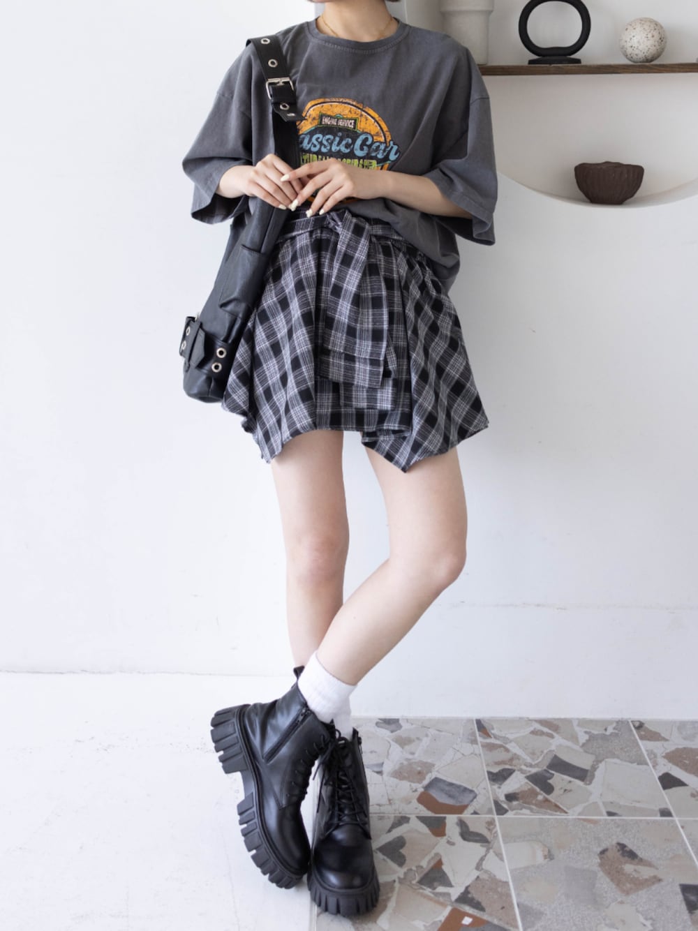 ロゴT×チェックミニでちょい辛めスクール風♪ ウエストに巻いたシャツがこなれ感をプラス。 厚底ブーツ&黒バッグでストリート要素をしっかりキープ!