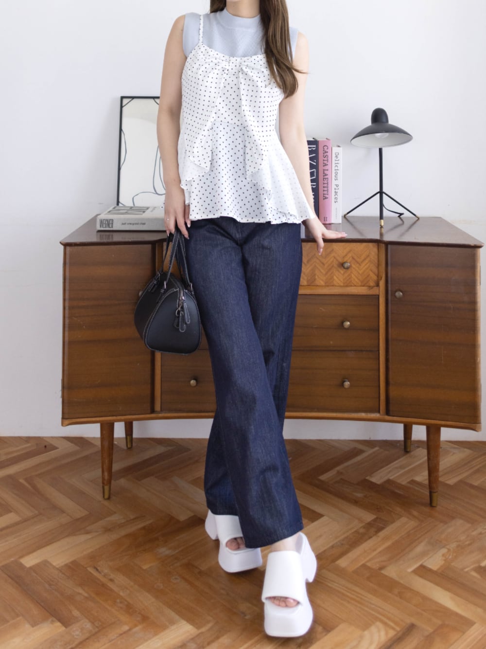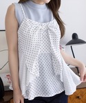 ドット柄キャミ×デニムで甘さとカジュアルのバランスが◎ 淡色トップスを重ねて、爽やかな夏っぽコーデに♪ 足元はボリュームサンダルで抜け感をプラスしました♡