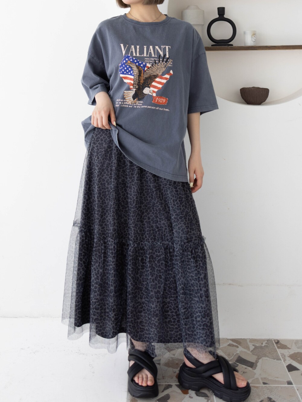 ロゴT×チュールレオパードで甘辛バランスが絶妙♪ オーバーサイズTでゆるっとラフに着こなして抜け感を◎ 足元は厚底サンダルでトレンド感もバッチリ!