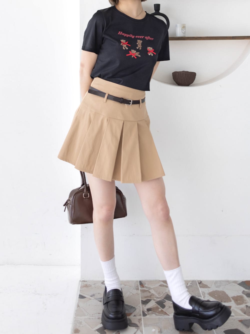 プリーツスカートを合わせることで Tシャツがラフになりすぎない カジュアルガーリーコーデです♡ くまちゃんのプリントがより可愛く感じさせます♪