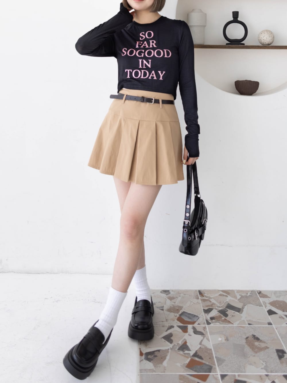 平成感があるロンTにプリーツスカートを合わせて Y2K風コーディネートです♪