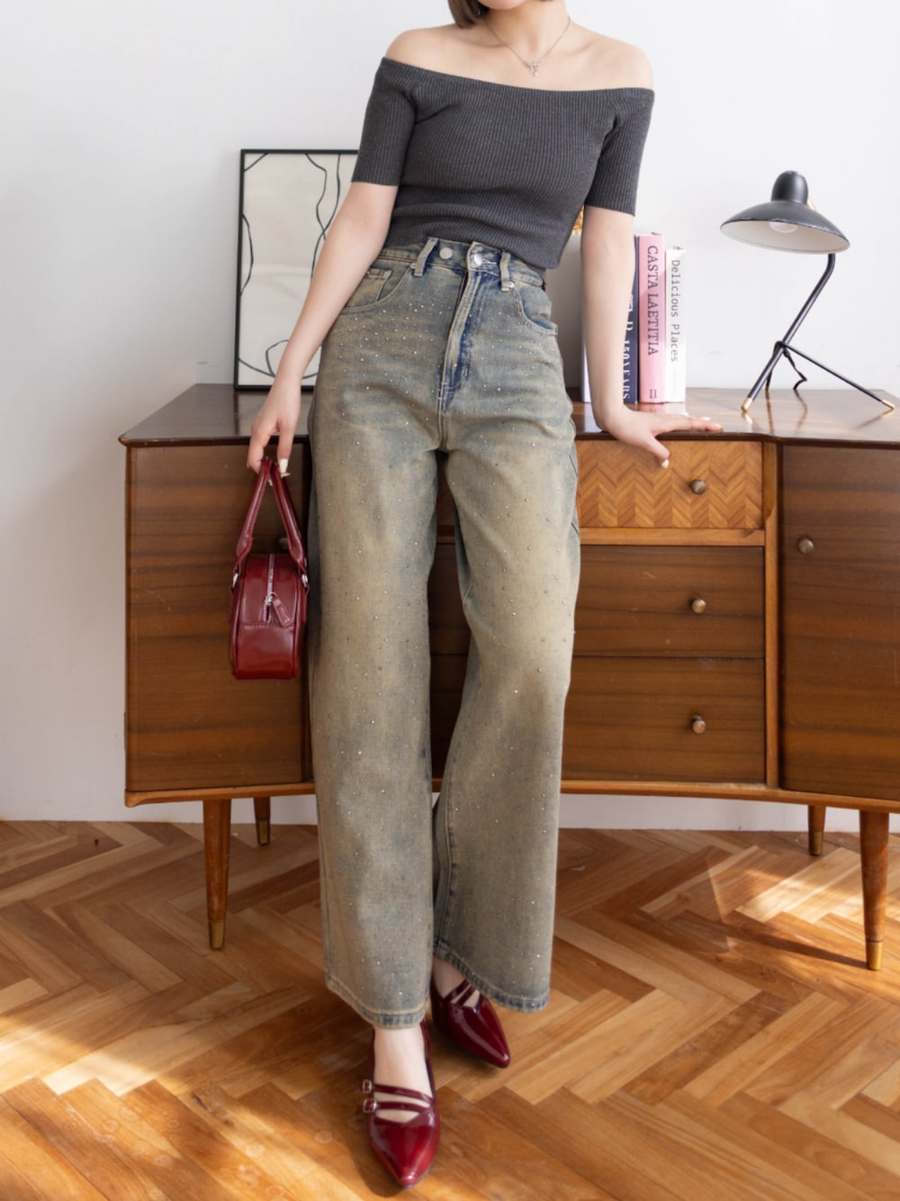 clear(クリア)(clear)のデニムパンツ「【低身長サイズ有】ラインストーン付きヴィンテージワイドデニムパンツ [ヴィンテージライク キラキラ]≪再入荷≫」を使ったコーディネート