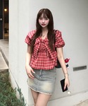 チェックのオフショルとラメデニムで 季節感と女性らしさを演出。 ボルドーの小物がコーデを程よく引き締めます。