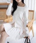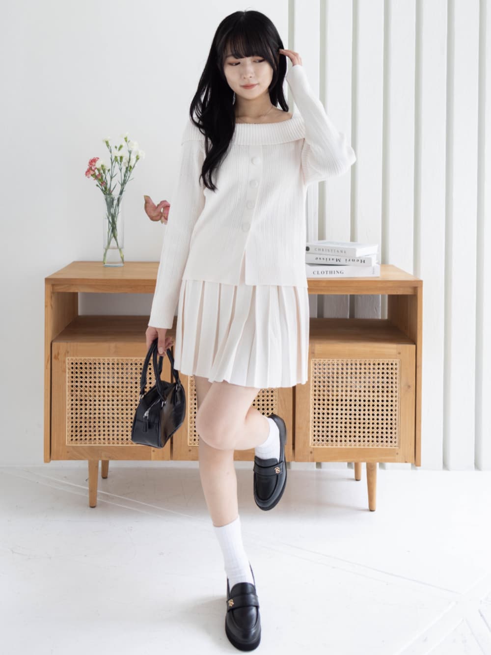 オフショル風のトップス×プリーツスカートで ガーリーさ全開のワントーンコーデ♡ ホワイトでまとめて清楚見えしつつ、小物は黒で引き締め! おしゃれもきちんと感も叶える、万能お出かけスタイルです♪