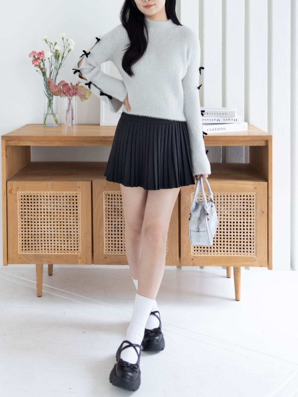 袖のリボンが可愛さをプラスする ふわニット×プリーツミニでガーリー全開♪ ブラック小物で引き締めて、大人っぽさもひとさじ◎