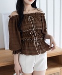 ブラウンのオフショルトップスで ほんのり色っぽくて夏らしい抜け感を演出♪ ショートパンツ&厚底サンダルでスタイルアップもばっちり◎
