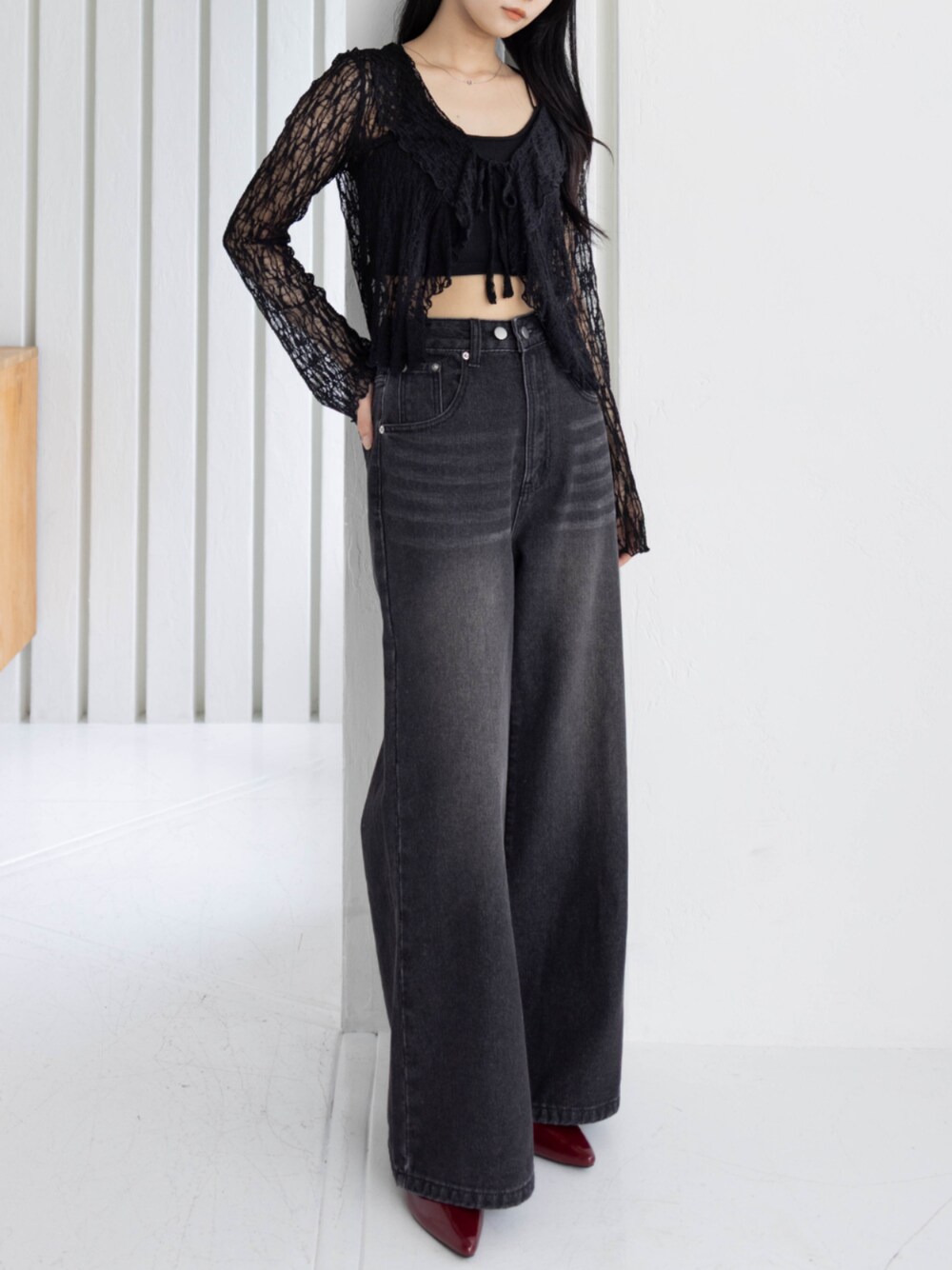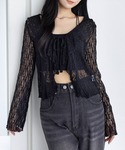 レーストップス×ハイウエストデニムで 甘さとクールさをMIXしたモードな着こなし♪ ブラックトーンでまとめて、洗練された雰囲気に◎