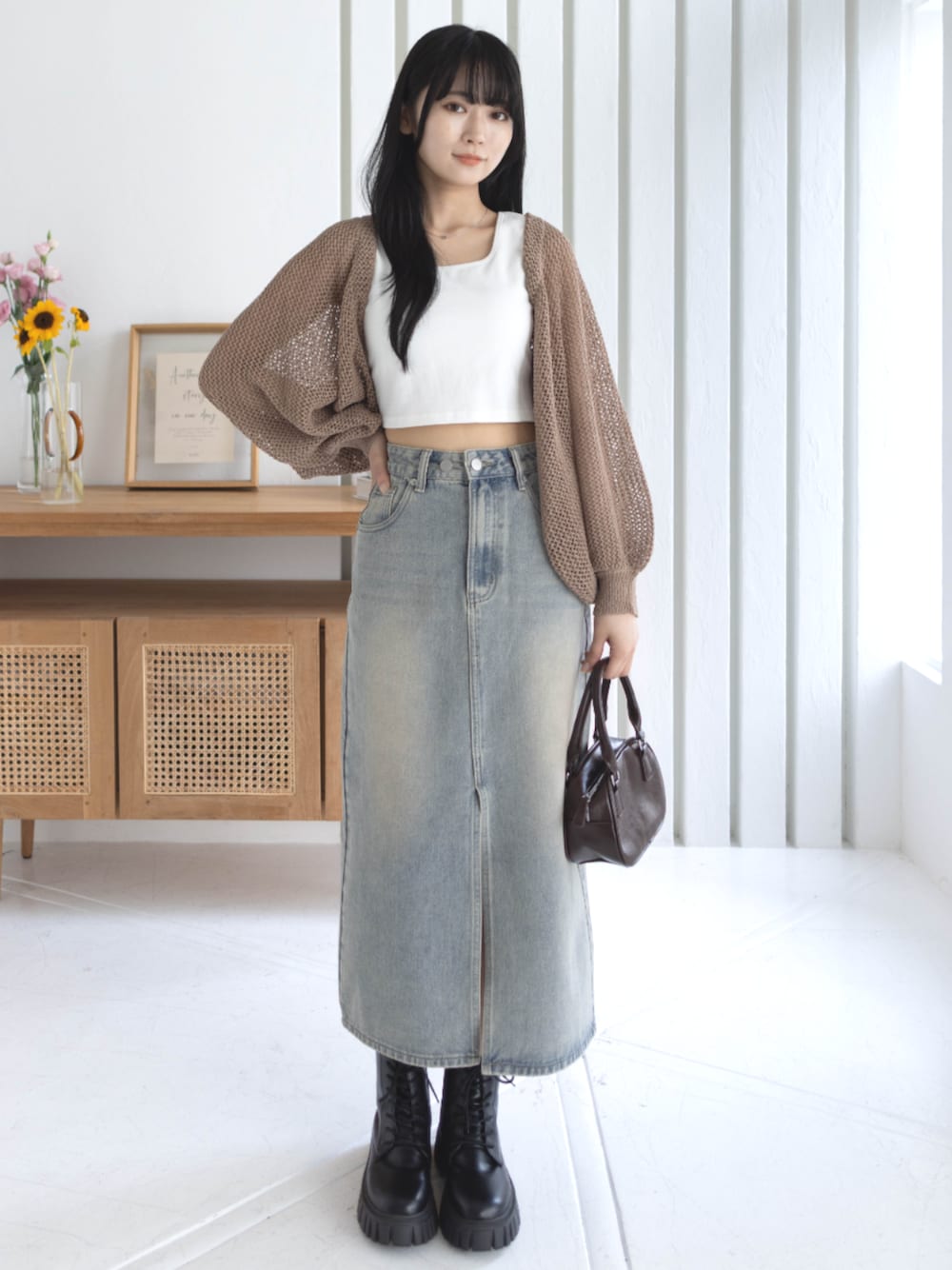 ショートトップス×ロングデニムで、 シルエットにメリハリを効かせたカジュアルコーデ♪ ゆるニットカーデで抜け感をプラスしつつ、黒ブーツで引き締め◎