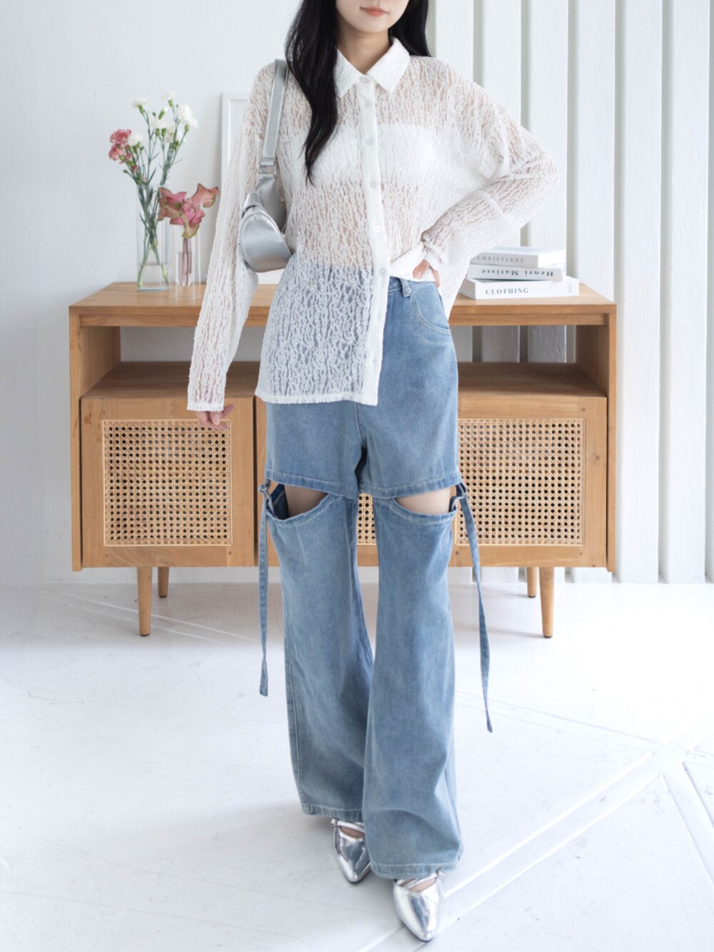 シアーなレースシャツに大胆カットのデニムを合わせて、 遊び心たっぷりのトレンドコーデ♪ シルバー小物でエッジを効かせて、モードに仕上げ◎