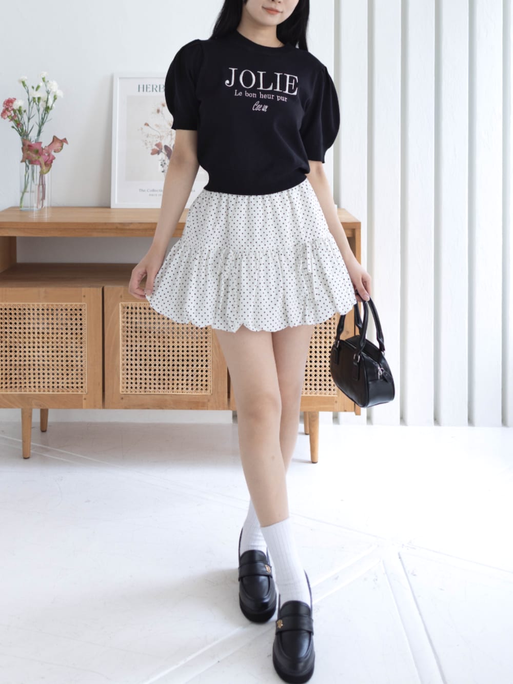 ロゴトップスにドットスカートを合わせて、 ガーリーなのに甘すぎないバランス感♪ モノトーン配色で大人っぽさもプラス◎