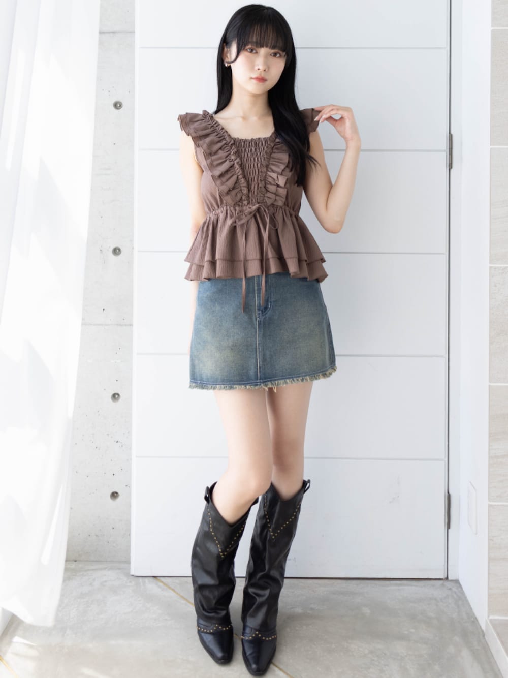 フリル×デニムの甘辛バランスがポイント♪ ウエスタンブーツで一気に秋ムード高まる☆