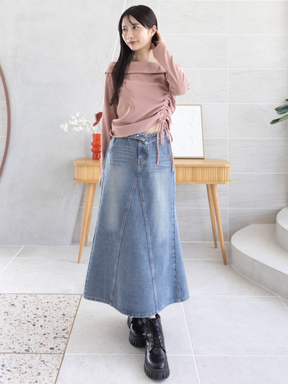 ピンクのオフショル風トップスが女性らしさを引き立ててくれます♪ デニムロングスカートでカジュアルさをプラスし、甘すぎない大人可愛いコーデに仕上げました!